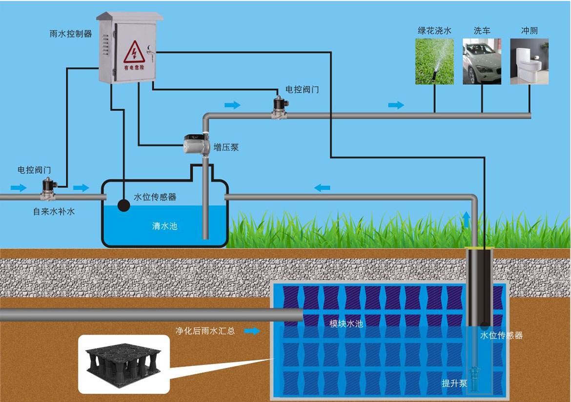 雨水收集利用是將路面和建筑屋面的雨水徑流,經過收集系統收集,進入儲水池,再經沉